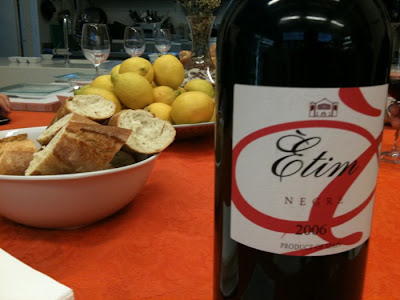 domingo, 21 febrero 2010El vino elegido para la comida fue Ètim Negre 2006, un tinto del Montsant compuesto de 60% Garnacha, 30% Mazuelo y 10% Syrah. La garnacha da unos vinos que por lo general envejecen rápido si no se apoyan en otra variedad. La mazuelo (que es otro nombre de la cariñena) le aporta acidez y taninos a este vino que es de un color cereza oscuro y tiene aromas de fruta roja madura, vainilla y notas de cuero. En la boca, es sabroso, con buena acidez y taninos suavemente integrados. Un vino elegante y de corte moderno que armonizó a la perfección con el toque picante de los callos y que no dejaba de acompañar bien a la carrillera y las mollejas del revuelto.